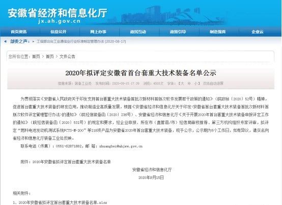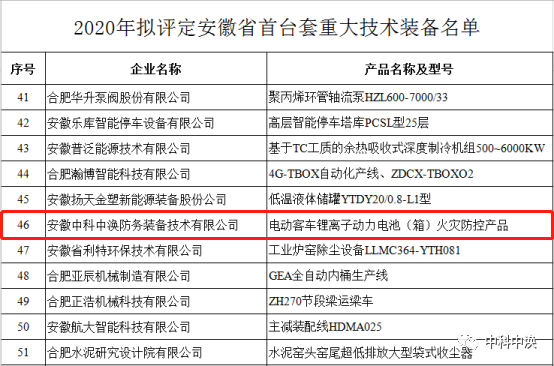 為促進首臺套重大技術裝備的研發應用,推動制造業高質量發展,經企業申報、所在市(直管縣/市)經信局審核推薦、第三方機構組織專家評審及公示,日前,安徽省經濟和信息化廳官網發布了“2020安徽省擬評定首臺套重大技術裝備名單”,安徽中科中渙防務裝備技術有限公司的“電動客車鋰離子動力電池(箱)火災防控產品”榮列其中。
