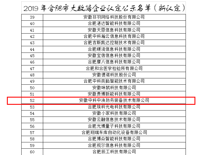近日,2019年合肥市大數據企業認定名單公示,本次認定主要根據《合肥市大數據企業認定管理辦法》(合數〔2018〕210號)相關要求進行公示,安徽中科中渙防務裝備技術有限公司順利入選。