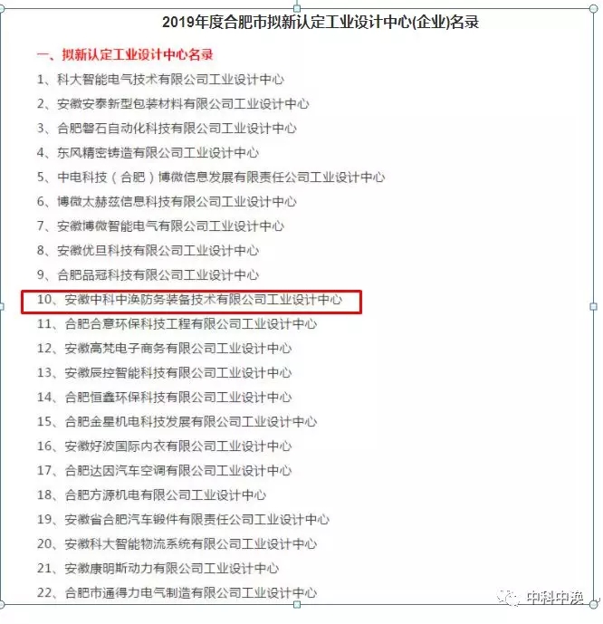 2019年11月13日,合肥市經濟和信息化局發布了關于2019年度合肥市擬新認定和復評合格的工業設計中心名錄的公示,根據《合肥市市級工業設計中心認定管理辦法(試行)》和《關于開展2019年度合肥市市級工業設計中心(企業)認定、復核工作的通知》要求,經合肥市經濟和信息化局審定,安徽中科中渙防務裝備技術有限公司入列2019年合肥市擬新認定工業設計中心名錄。