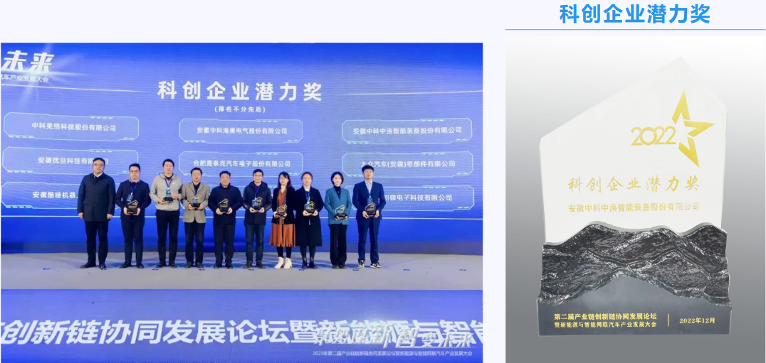 大會組委邀請了省市產業主管部門頒發2022年度安徽省創新場景示范獎、科創企業潛力獎、創新技術攻關獎、行業卓越貢獻獎共四類獎項,以表彰對新能源與智能網聯汽車產業做出卓越貢獻的企業,其中,安徽中科中渙智能裝備股份有限公司榮獲2022年度安徽省科創企業潛力獎。