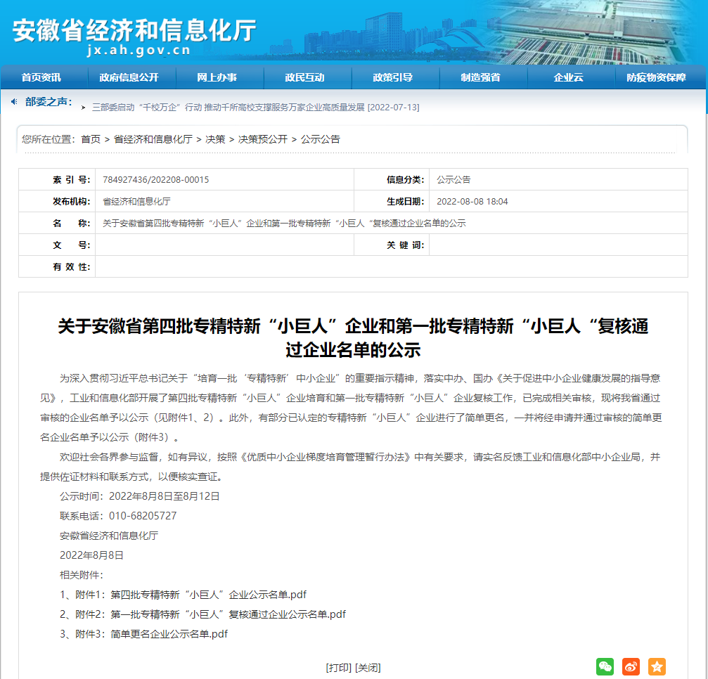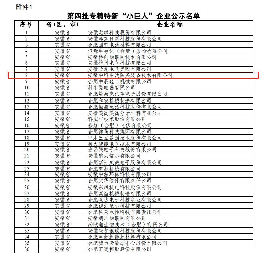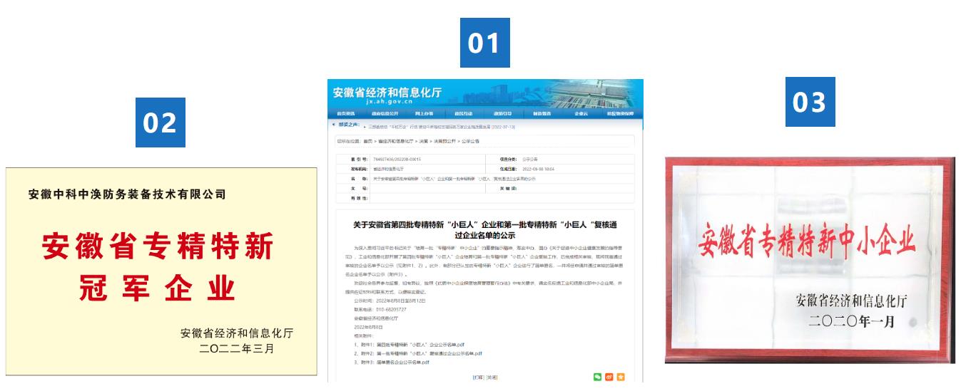 為深入貫徹習近平總書記關于“培育一批‘專精特新’中小企業”的重要指示精神,落實中辦、國辦《關于促進中小企業健康發展的指導意見》,工業和信息化部開展了第四批專精特新“小巨人”企業培育和第一批專精特新“小巨人”企業復核工作。日前,安徽省經信廳公示了復核通過的企業名單,全省新增259家專精特新“小巨人”企業,其中,安徽中科中渙防務裝備技術有限公司成功入選國家級第四批專精特新“小巨人”企業。