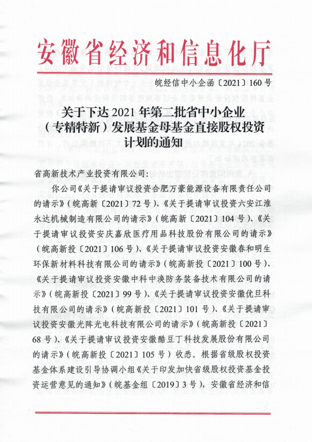 近日,省經濟和信息化廳下達了2021年省中小企業(民營經濟)發展專項資金,全省共876個項目,資金總額4.7402億元,其中,安徽中科中渙防務裝備技術有限公司成功獲得安徽省專精特新中小企業發展專項資金注資。