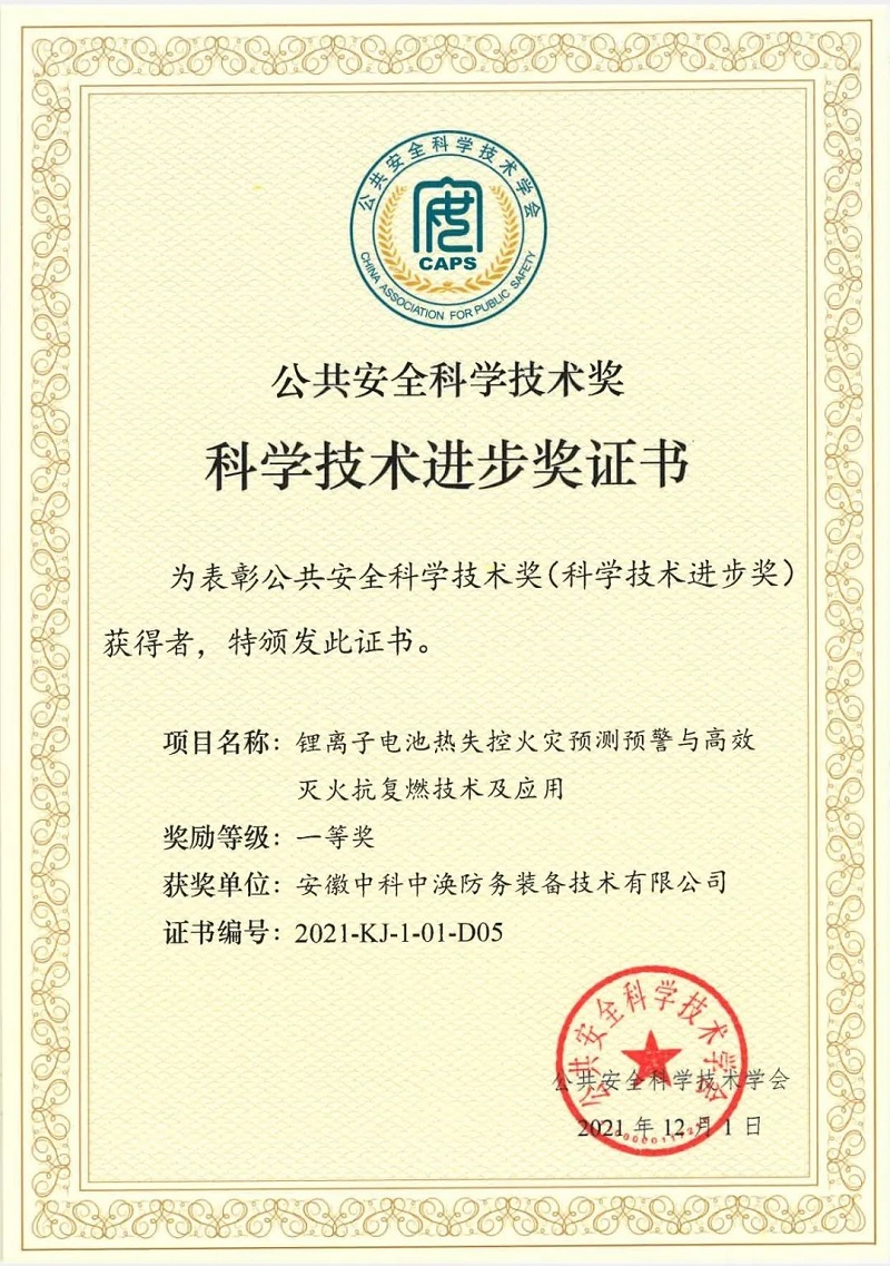 2021年年末之際,中科中渙再傳喜報,在公共安全和智能交通領域大放異彩,“鋰離子電池熱失控火災預測預警與高效滅火抗復燃技術及應用”項目榮獲公共安全科學技術獎(科學技術進步獎)一等獎。