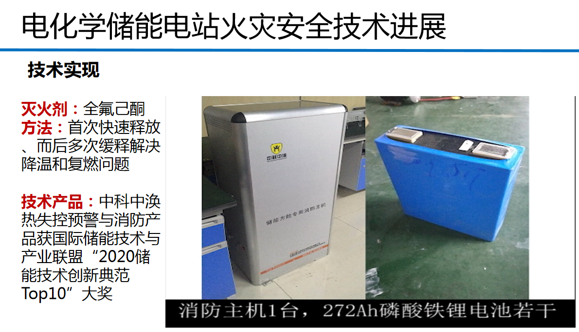 3、快速精準滅火與抗復燃技術。團隊對不同的滅火藥劑,例如水、七氟丙烷、二氧化碳、氣溶膠等這些滅火藥劑進行了系統的試驗,從這些滅火的試驗來看,七氟丙烷滅火效果較好,二氧化碳稍弱。如果電池模組使用水系滅火,要防止產生短路,對滅火器要求快速滅火、高效冷卻,而且冷卻、絕緣。對滅火技術要求防止復燃,兼具多次滅火的功能。為此,在這里主要是通過滅火劑來實現,我們推薦全氟己酮,方法是首次快速釋放,而后多次緩釋解決降溫和復燃問題。這個技術在中科中渙得到了產業化,在今年得到了2020儲能技術創新典范TOP10的大獎。