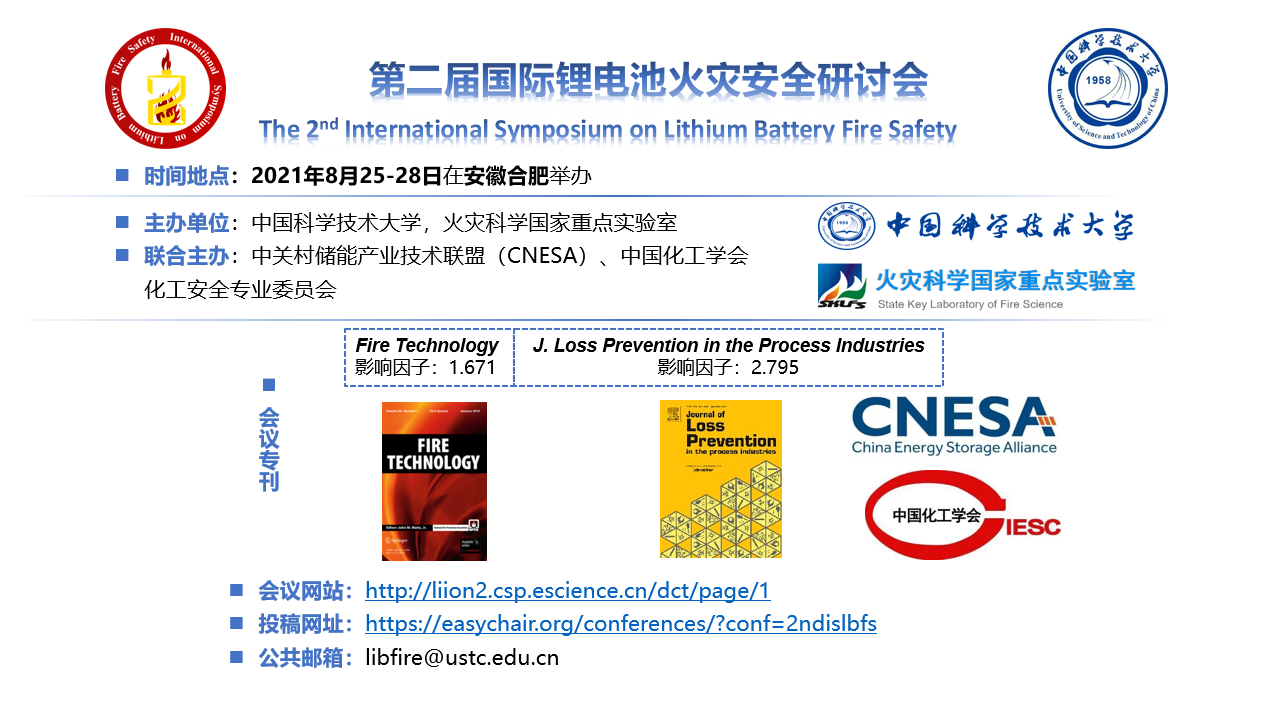 預告:2021年8月25日至28日,在合肥將要舉辦第二屆國際鋰離子電池的安全研討會,第一屆是去年在合肥成功舉辦,參會人員接近三百人,包括十幾個國家和地區,同時與一些著名的火災安全方面的期刊合作,把優秀的論文進行發表。