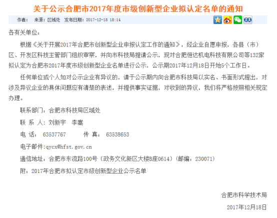 http://www.hfst.gov.cn/11251/11264/201712/t20171218_2425782.html(合肥市科技局網(wǎng)站公示鏈接)