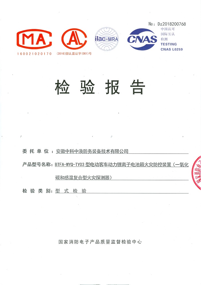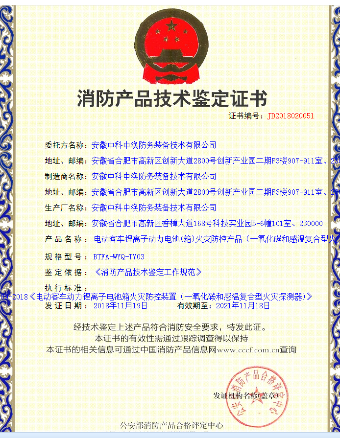 作為首家送樣到沈陽消防所研究中心的企業,中科中渙電動客車動力鋰離子電池箱火災防控裝置率先滿足相關的技術鑒定條目。并于2018年9月26號完成型式檢驗,并取得型式檢驗報告,2018年11月19日獲得國家應急管理部消防產品合格評定中心頒發的消防技術鑒定證書(證書編號: JD2018020051)。